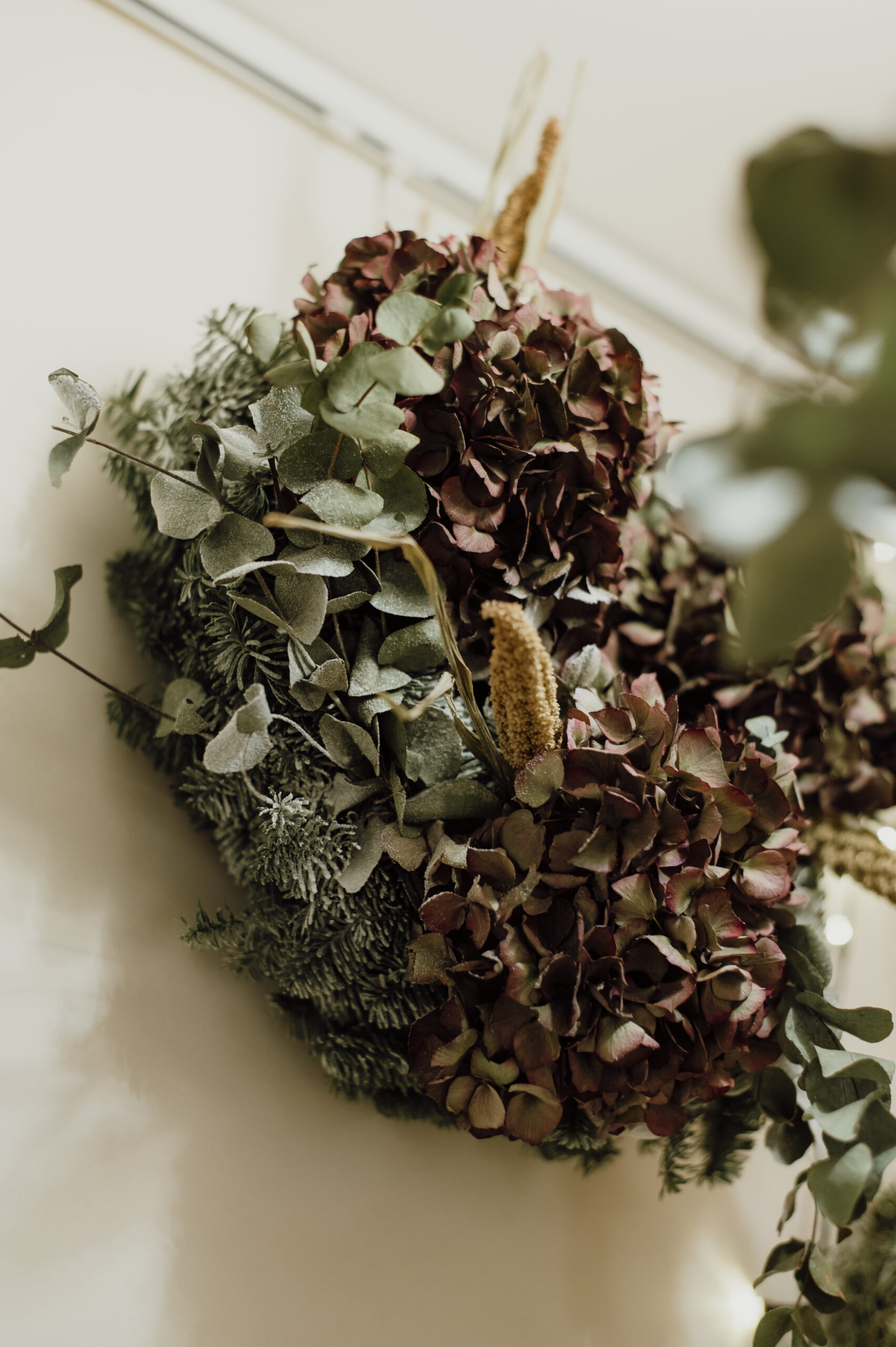 Composition : Base de sapin frais & de décoration florale en fleurs séchées